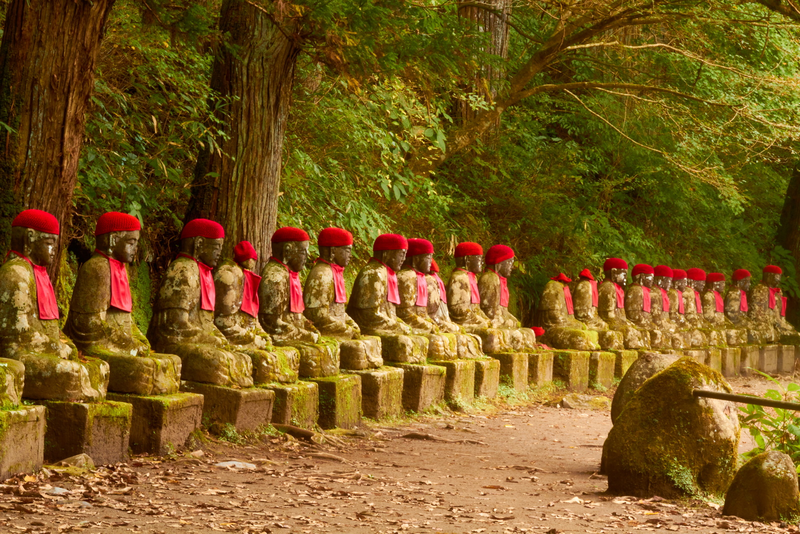 Statue of Jizo, a Bodhisattva protector of the deceased, children, travellers | Kanmangafuchi Abyss (憾満ヶ淵), Nikkō (日光市 Nikkō-shi), Toshigi Prefecture, Japan | October 2016